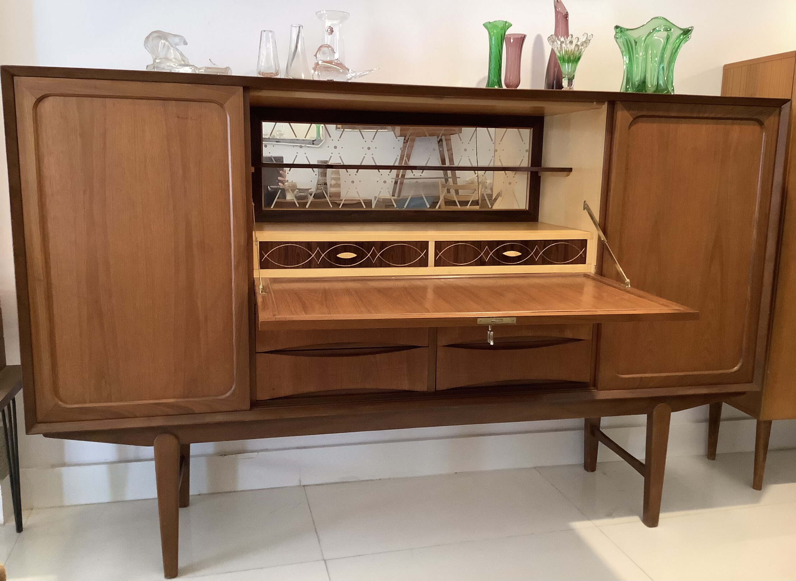 -Distribución: dos puertas de corredera con dos baldas al interior y al centro cuatro cajones y puerta abatible que deja ver dos cajones, balda y espejo todo decorado. Conserva la llave.